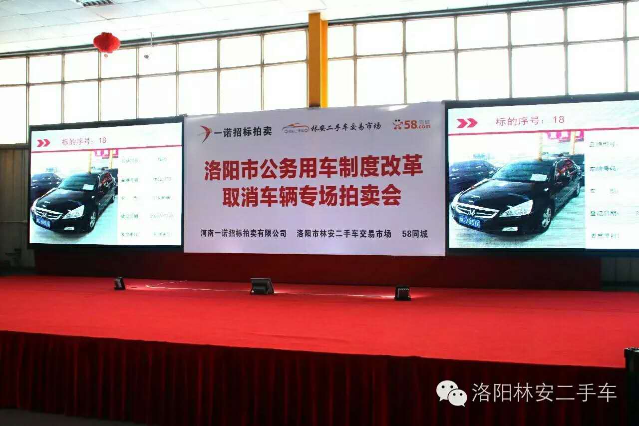 2016年5月12日14时河南一诺招标拍卖有限公司在洛阳市洛龙区龙门大道122号洛阳市林安二手车交易市场D馆二楼北侧拍卖大厅(原洛阳师范学院正对面)公开举行“洛阳市洛龙区公务用车制度改革取消车辆专场拍卖会”。拍卖标的有:雅阁、丰田、帕萨特、现代等100辆公务用车。
